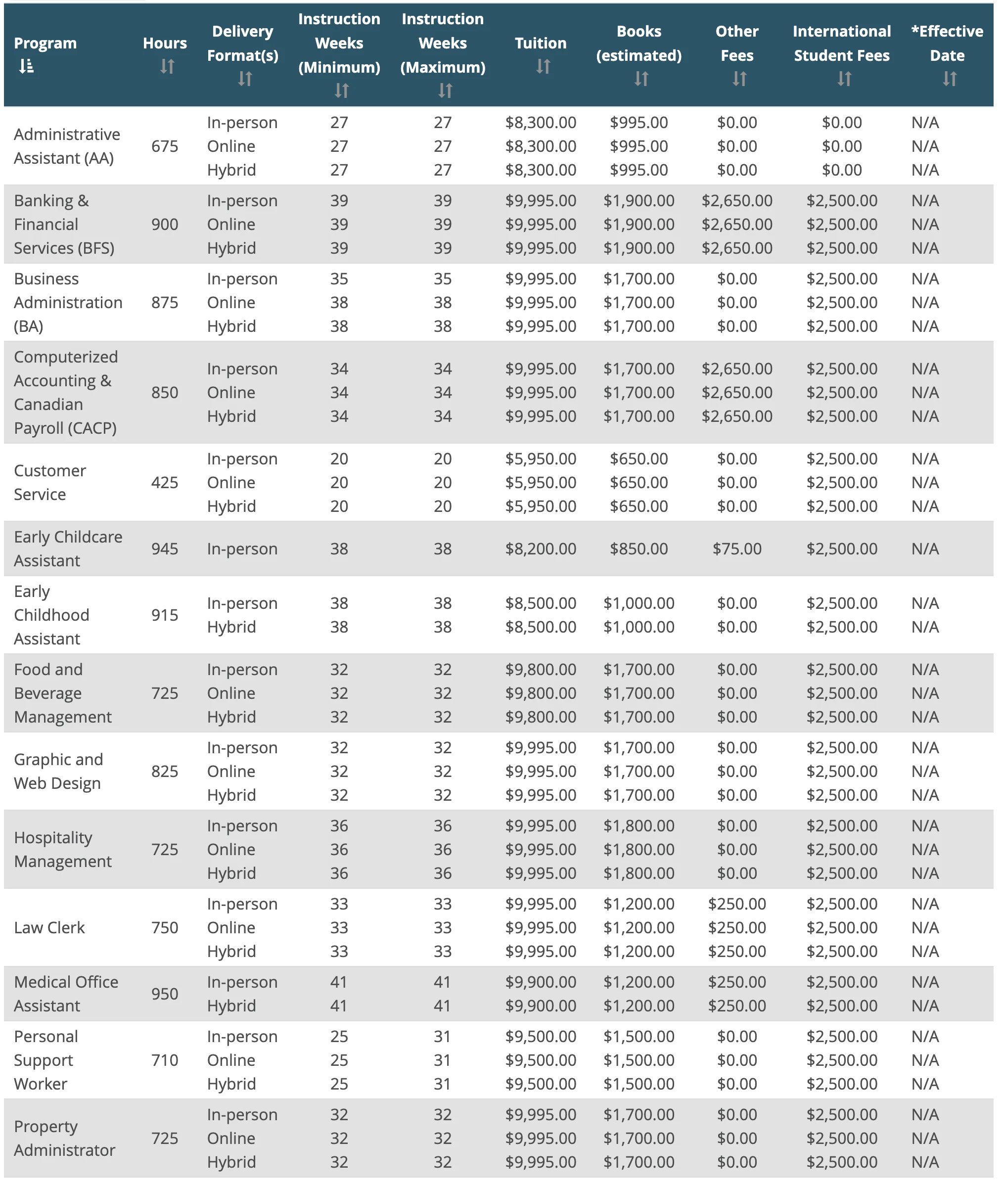 PROGRAM WEEKS HOURS TUITION BOOKS OTHER FEES TOTAL (DOMESTIC) EFFECTIVE DATE